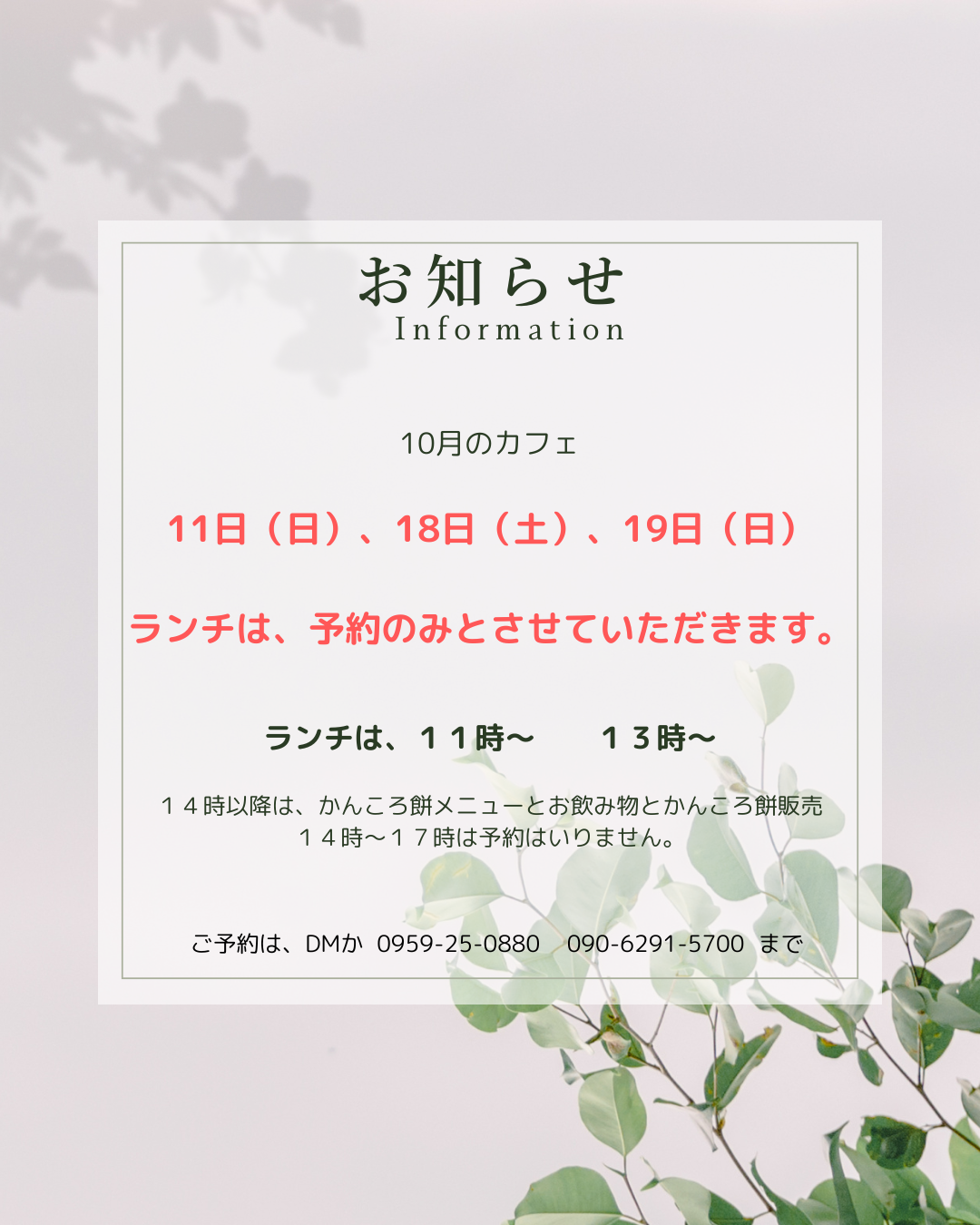 ふらっとお立ち寄りいただくお客様も大事にしたくて、大変悩みましたが、10月は、試験的にランチは予約のみといたします。